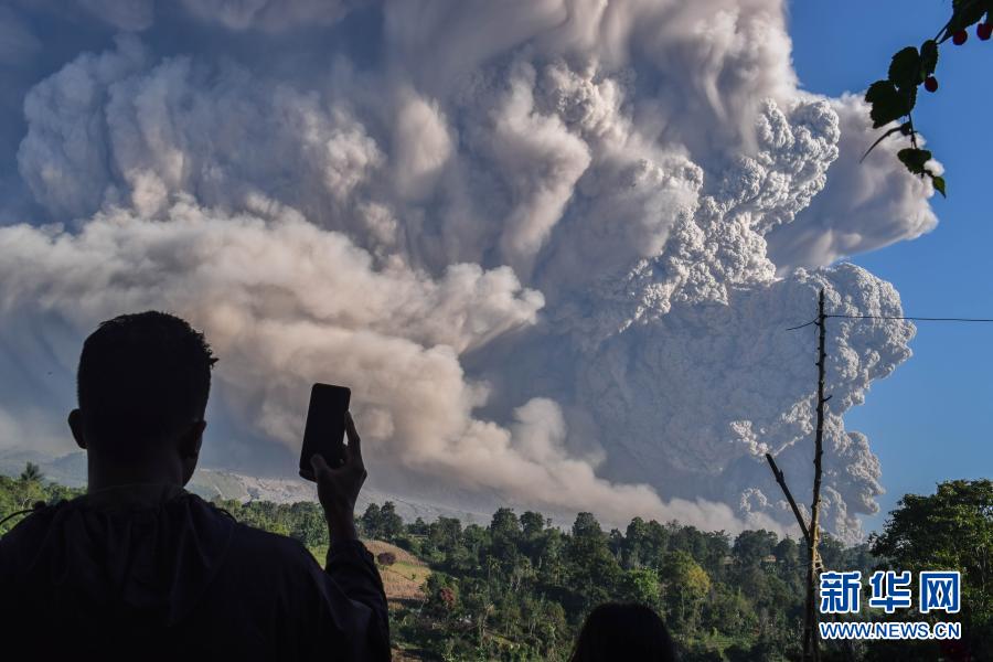 3月2日,一名男子在印度尼西亞北蘇門答臘省卡羅觀看噴發(fā)的錫納朋火山。新華社發(fā)(森比林攝)