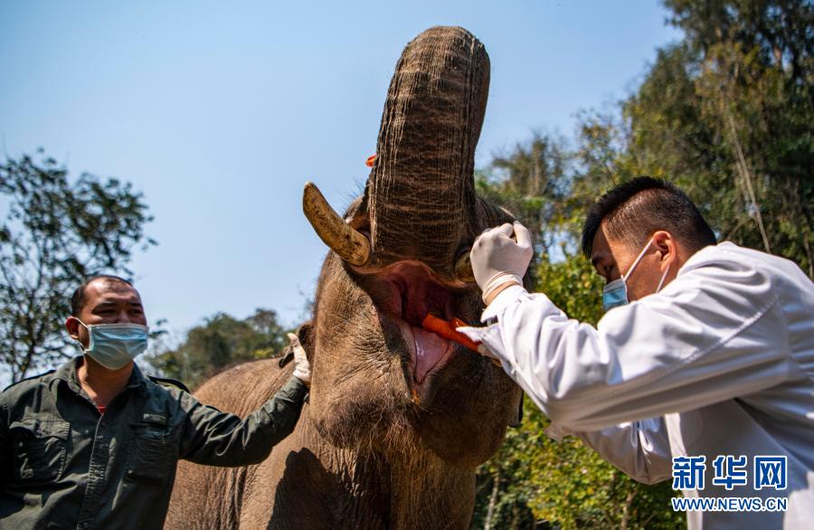 “象爸爸”為一頭名叫“小強(qiáng)”的大象檢查口腔(3月6日攝)。