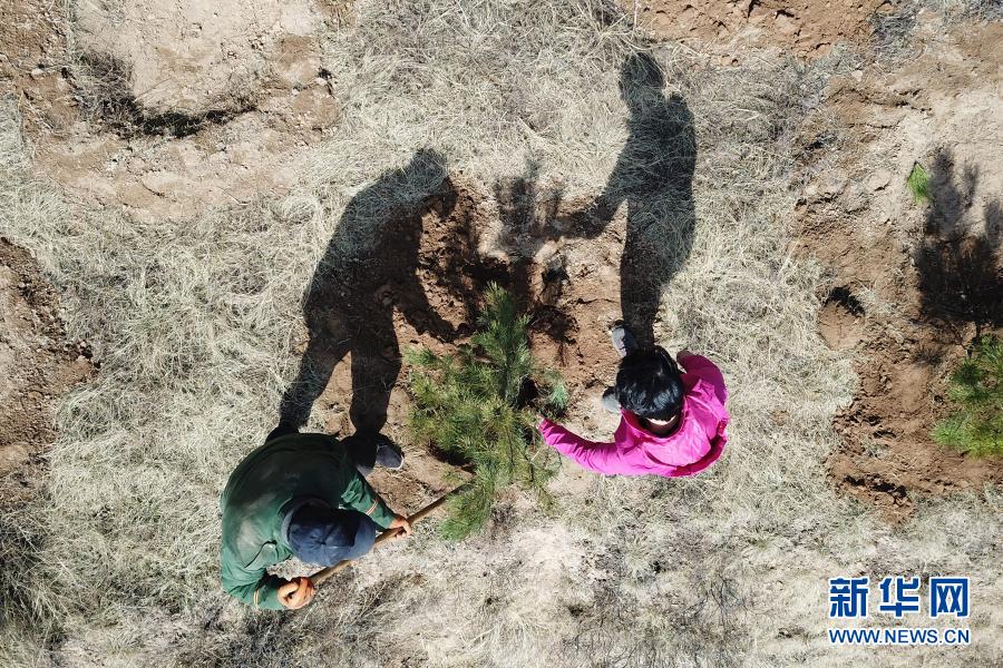 3月11日,在平?jīng)鍪嗅轻紖^(qū)白水鎮(zhèn)焦莊村北山,張文玉(右)現(xiàn)場(chǎng)指導(dǎo)工人種植油松(無(wú)人機(jī)照片)。