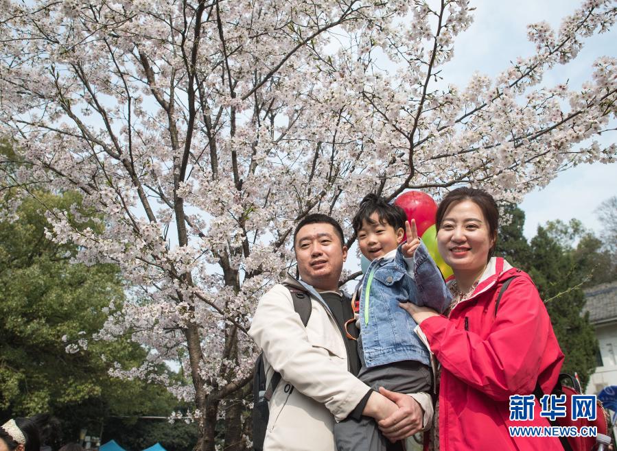3月13日,遼寧援鄂醫(yī)療隊丹東市中心醫(yī)院護士李杰(右)與家人在武漢大學(xué)櫻花樹下合影。新華社記者 肖藝九 攝
