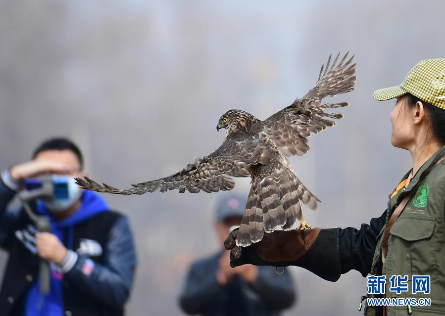 3月14日,沈陽猛禽救助中心志愿者將救助的蒼鷹進行放飛。