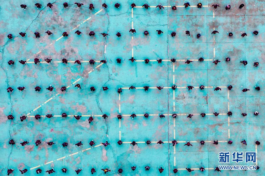 騎路小學(xué)學(xué)生們?cè)诖笳n間進(jìn)行跳繩鍛煉(3月9日攝,無(wú)人機(jī)照片)。新華社記者 李博 攝