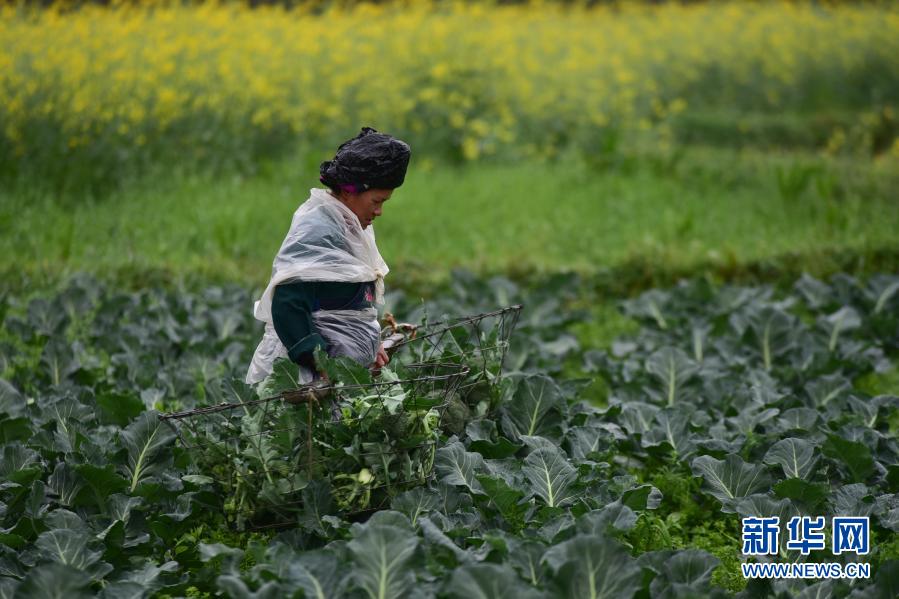 3月20日,村民在貴州省丹寨縣揚(yáng)武鎮(zhèn)金湖社區(qū)蔬菜種植基地采收西藍(lán)花。