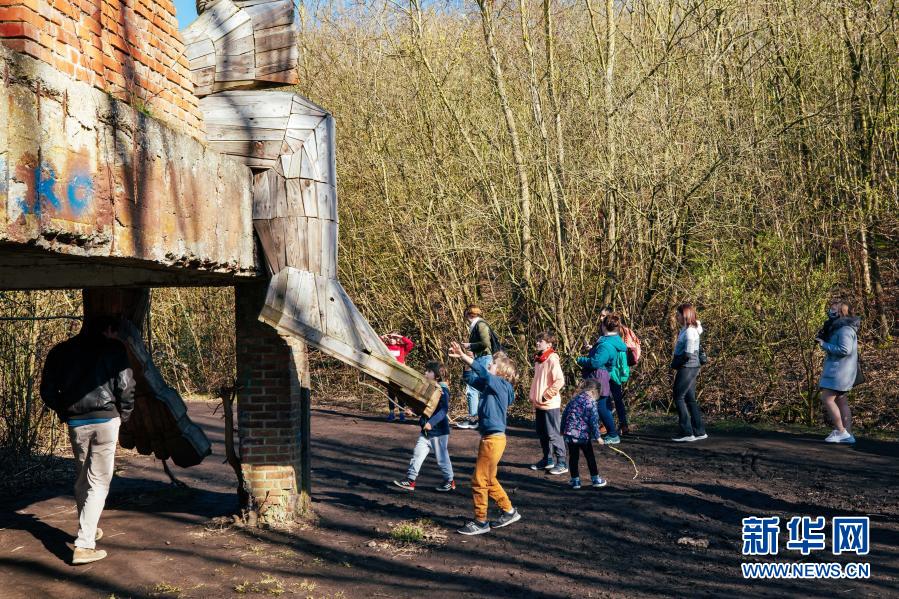 3月20日,人們?cè)诒壤麜r(shí)博姆市的德舒爾森林公園和一座“巨人”雕塑“玩?!?。新華社記者 張鋮 攝