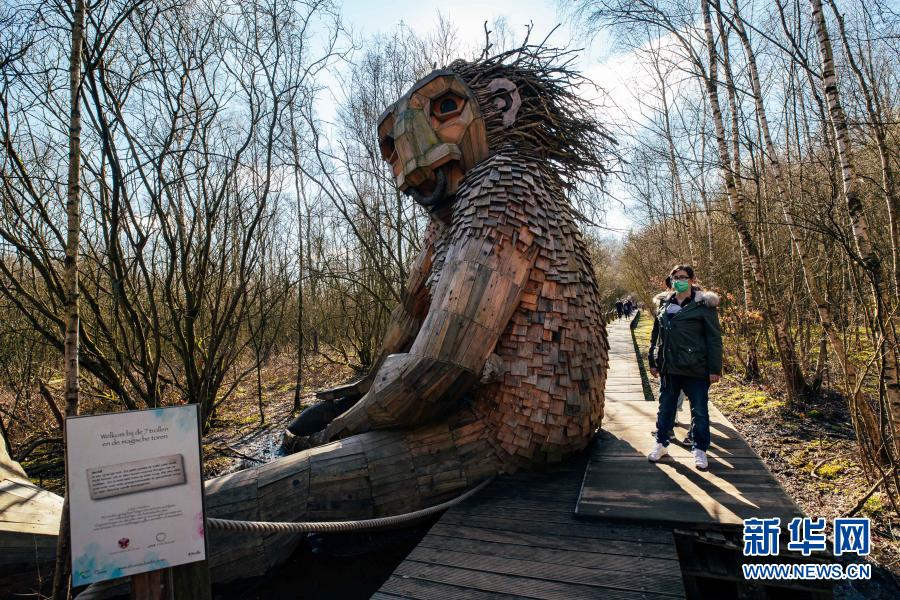 3月20日,人們在比利時(shí)博姆市的德舒爾森林公園觀賞一座“巨人”雕塑。新華社記者 張鋮 攝