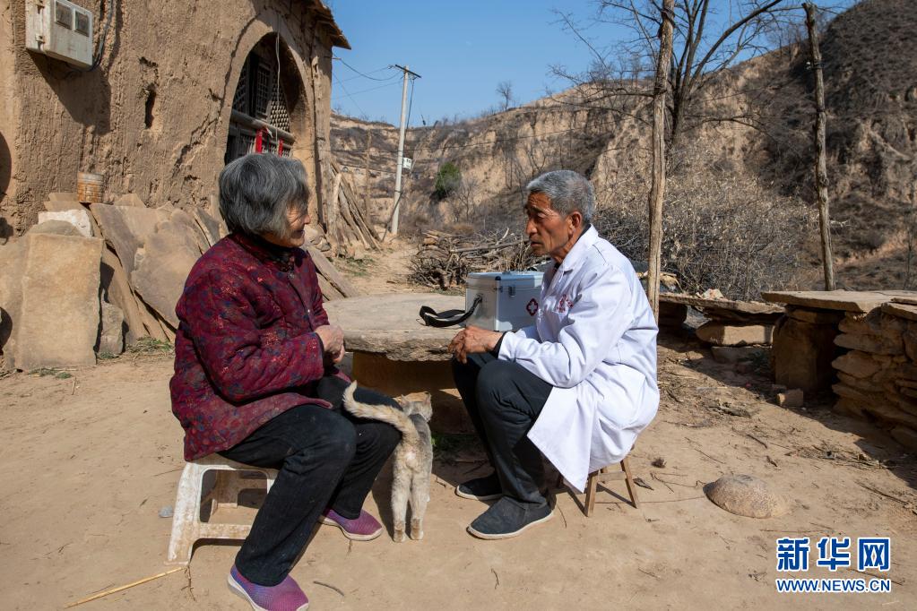 在山西省石樓縣鐵頭村寺山自然村,張尚保(右)在為村民講解健康知識(shí)(3月24日攝)。新華社記者 楊晨光 攝