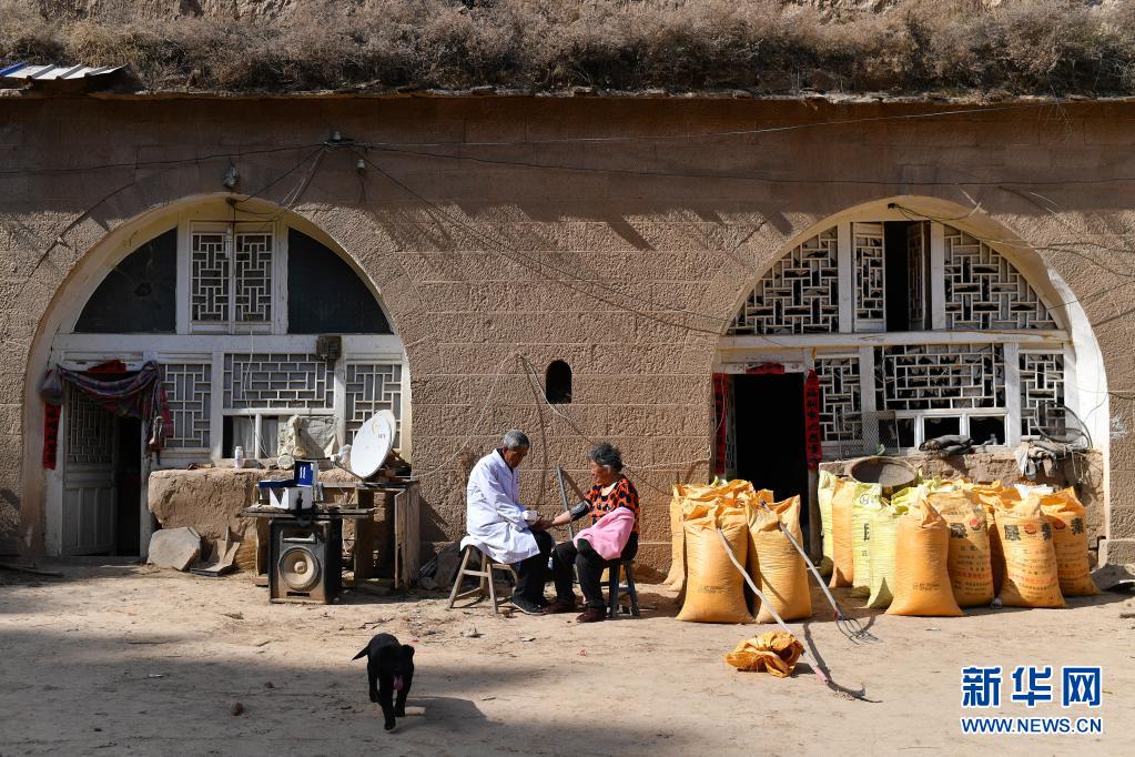 在山西省石樓縣鐵頭村寺山自然村,張尚保在為村民測量血壓(3月24日攝)。新華社記者 詹彥 攝