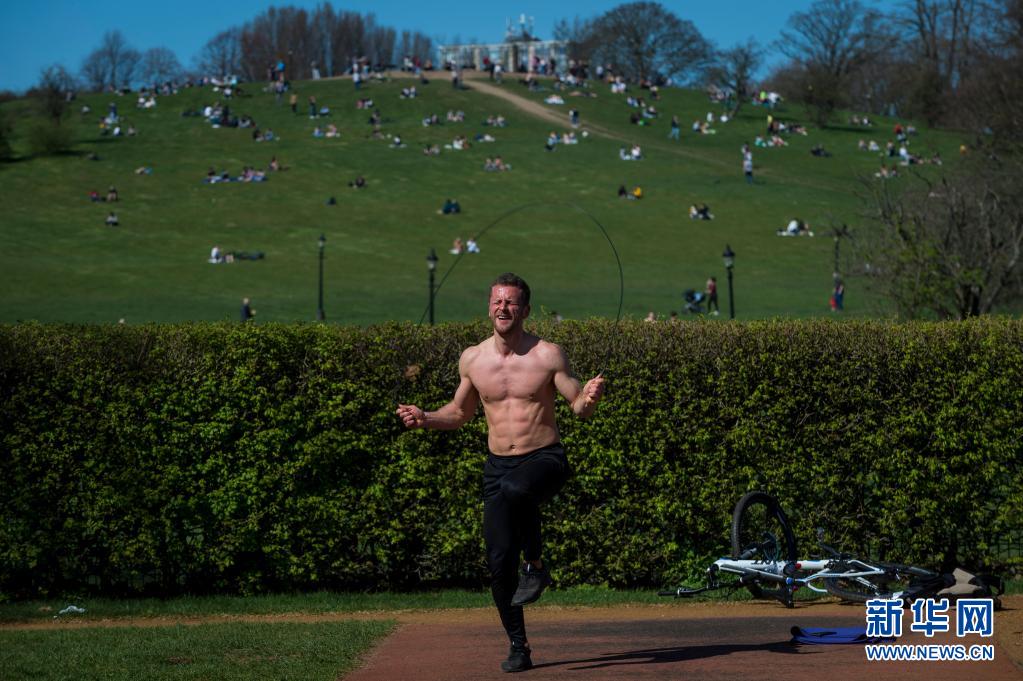 3月29日,一名男子在英國(guó)倫敦報(bào)春花山的戶外健身區(qū)域鍛煉。