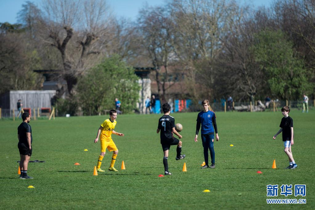 3月29日,人們?cè)谟?guó)倫敦?cái)z政公園踢足球。