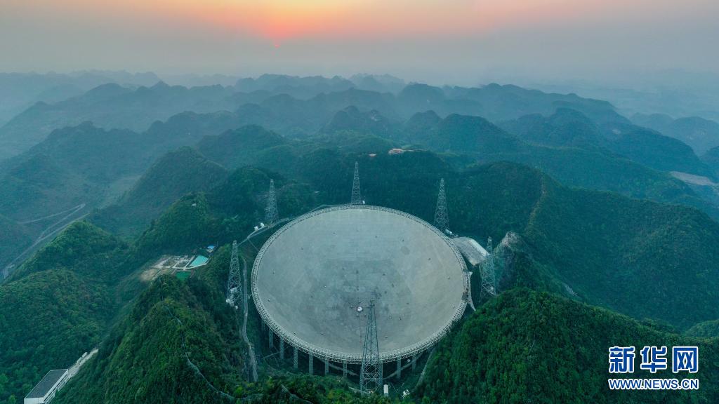 在貴州省平塘縣,被譽(yù)為“中國天眼”的500米口徑球面射電望遠(yuǎn)鏡(FAST)在群山中仰望星空,探求著宇宙奧秘。