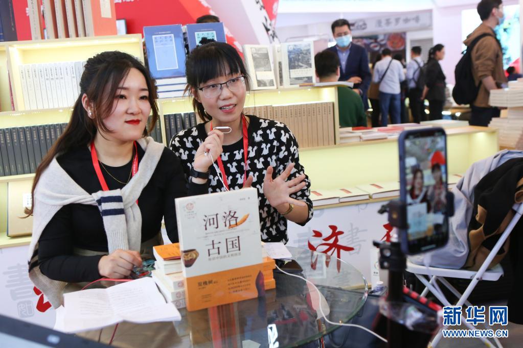 3月31日,參展人員在河南出版展區(qū)直播推介書籍。