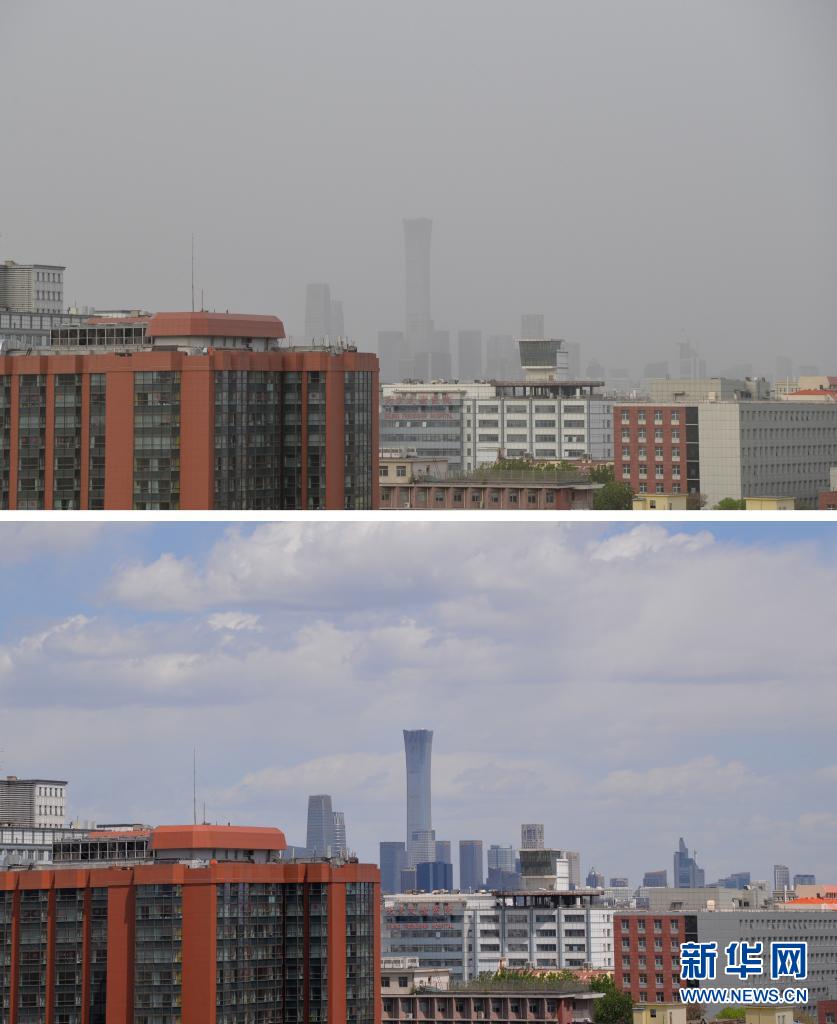 這是一張拼版照片:上圖為5月6日在北京市西城區(qū)陶然亭附近拍攝的北京CBD;下圖為5月1日在北京市西城區(qū)陶然亭附近拍攝的北京CBD。