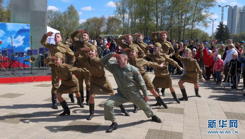 5月9日,人們?cè)诎锥砹_斯首都明斯克觀看勝利日節(jié)慶表演。