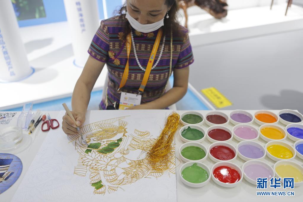 5月8日,一名參展商在消博會現場制作景泰藍畫。新華社記者 丁洪法 攝