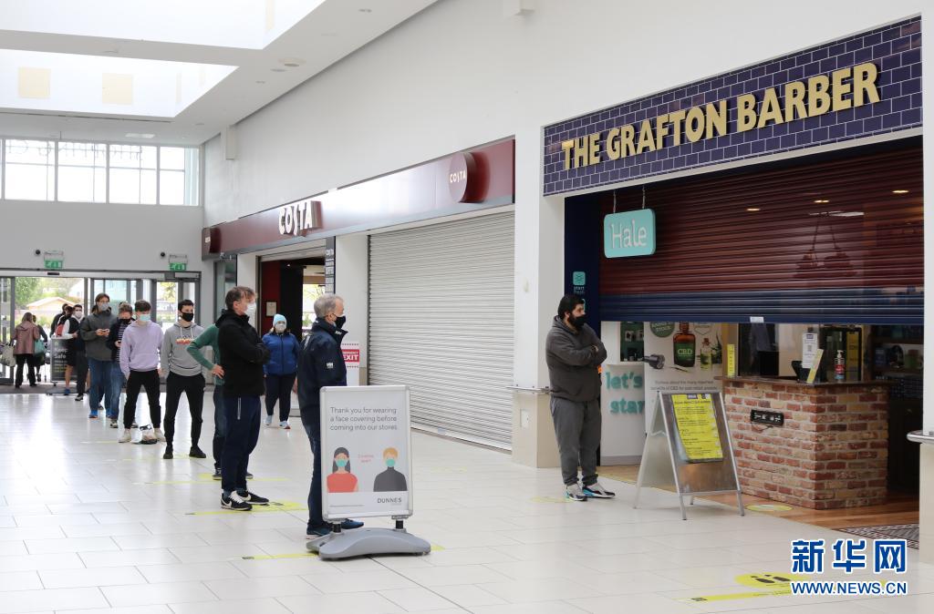 5月10日,人們?cè)趷?ài)爾蘭首都都柏林一家重新恢復(fù)營(yíng)業(yè)的理發(fā)館外排隊(duì)。