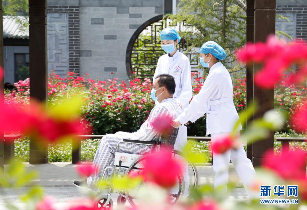 5月11日,河北省邢臺市南和區(qū)人民醫(yī)院護(hù)士在院區(qū)陪伴患者,將關(guān)懷融入日常護(hù)理。