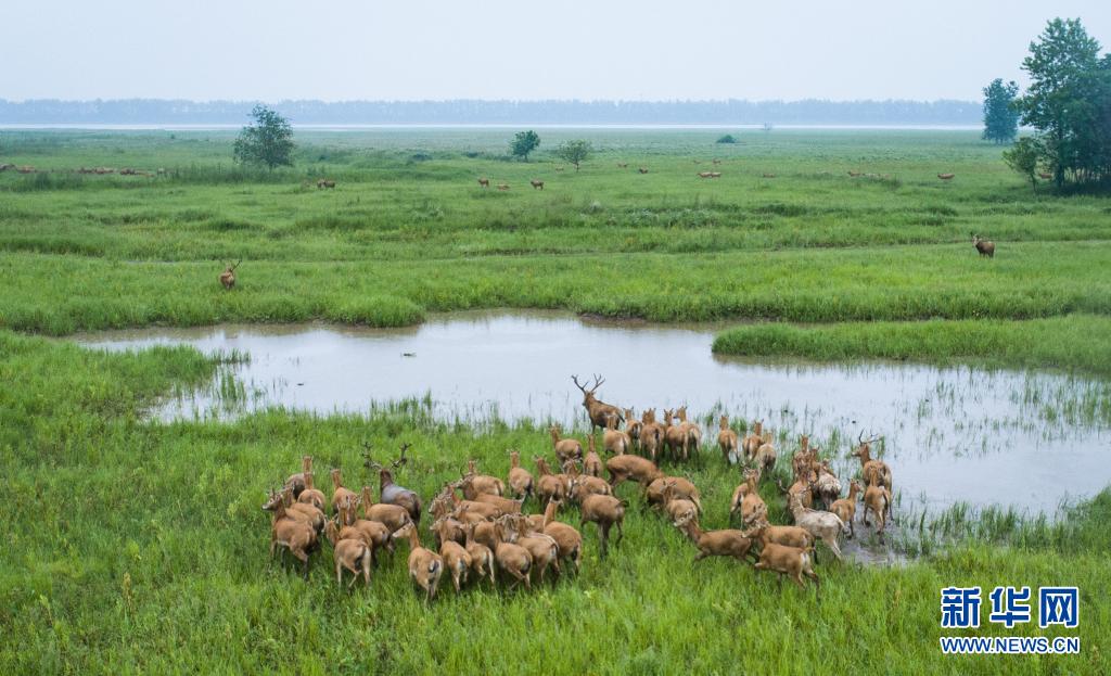 5月17日,一群麋鹿在石首麋鹿國家級自然保護(hù)區(qū)內(nèi)活動(無人機(jī)照片)。新華社記者 肖藝九 攝