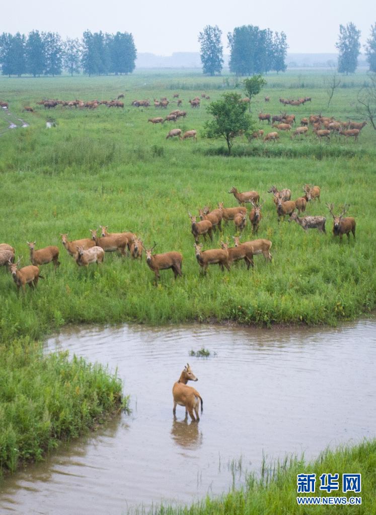 5月17日,一群麋鹿在石首麋鹿國(guó)家級(jí)自然保護(hù)區(qū)內(nèi)活動(dòng)(無人機(jī)照片)。新華社記者 肖藝九 攝