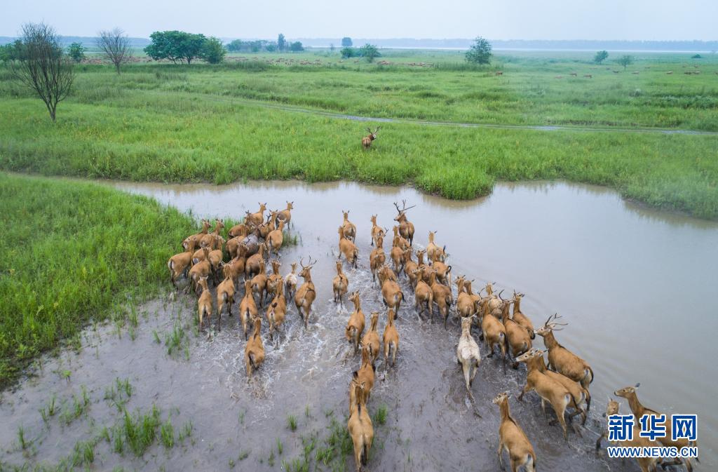 5月17日,一群麋鹿在石首麋鹿國家級自然保護區(qū)內(nèi)活動(無人機照片)。新華社記者 肖藝九 攝