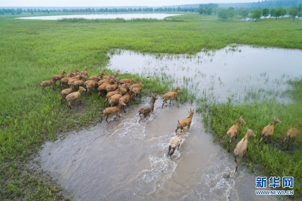 5月17日,一群麋鹿在石首麋鹿國家級(jí)自然保護(hù)區(qū)內(nèi)活動(dòng)(無人機(jī)照片)。新華社記者 肖藝九 攝
