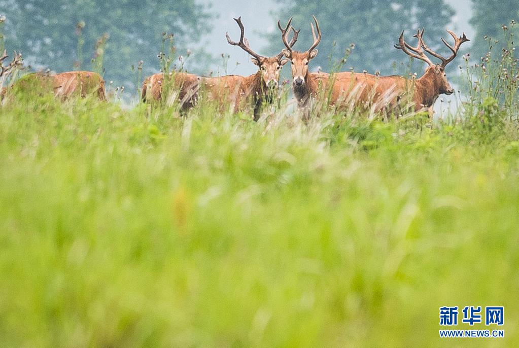 5月17日,一群麋鹿在石首麋鹿國家級自然保護(hù)區(qū)內(nèi)活動。新華社記者 肖藝九 攝