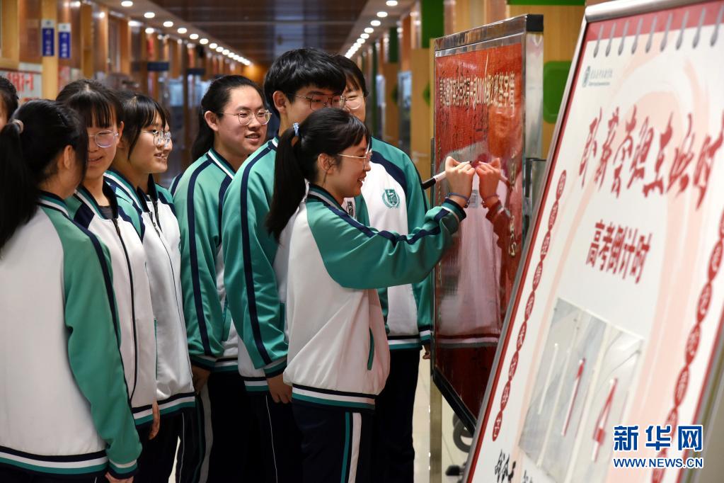 5月23日,青島通濟實驗學(xué)校高三學(xué)生在簽名板上留言相互鼓勵。