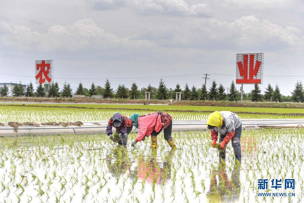 5月26日,在吉林省吉林市永吉縣萬(wàn)昌鎮(zhèn)宇豐米業(yè)2萬(wàn)畝高標(biāo)準(zhǔn)水田基地,農(nóng)民進(jìn)行水稻補(bǔ)苗工作。