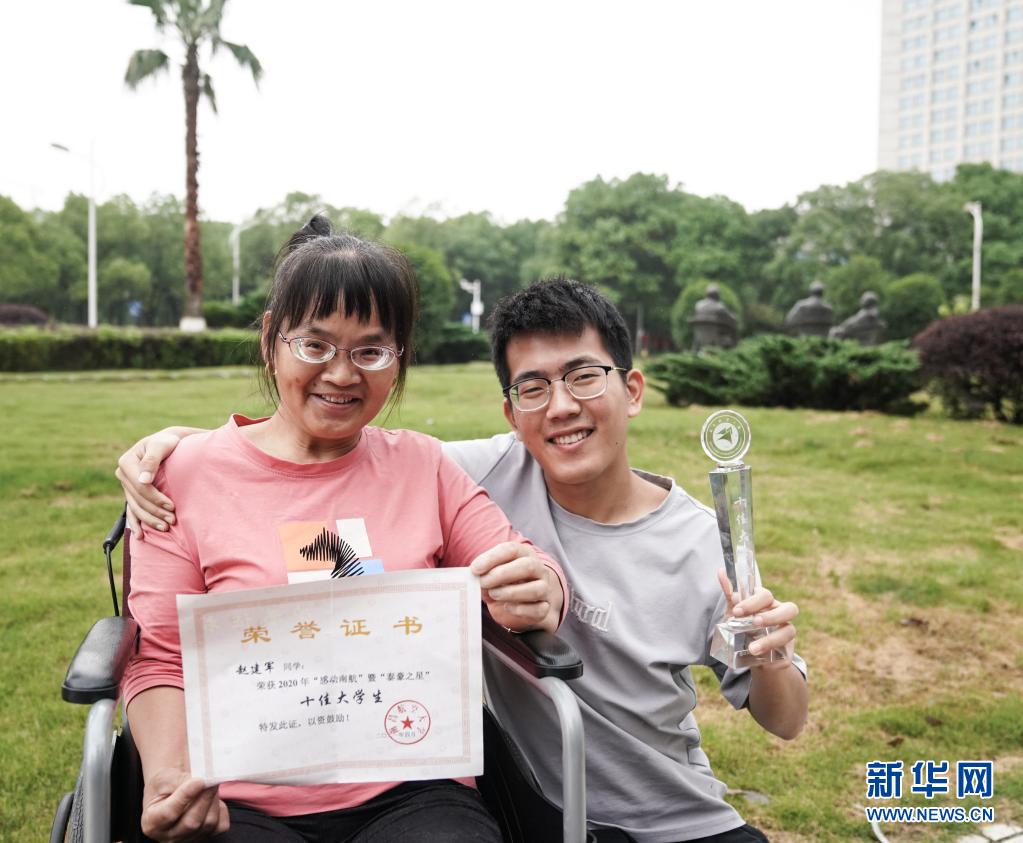 6月2日,趙建軍和母親在校園內合影并展示近日獲得的榮譽證書。