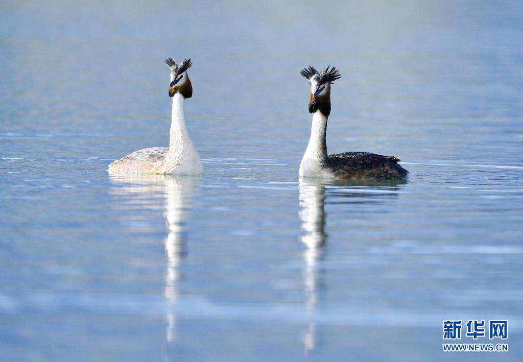 6月14日在拉魯濕地拍攝的兩只鳳頭??。夏日里,鳳頭??和小??在西藏拉薩拉魯濕地國家級自然保護區(qū)水面上嬉戲。新華社記者 張汝鋒 攝