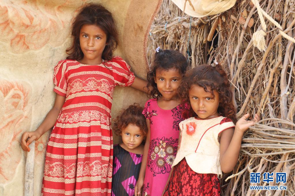 6月17日,孩子們站在也門北部哈杰省一座難民營內(nèi)。