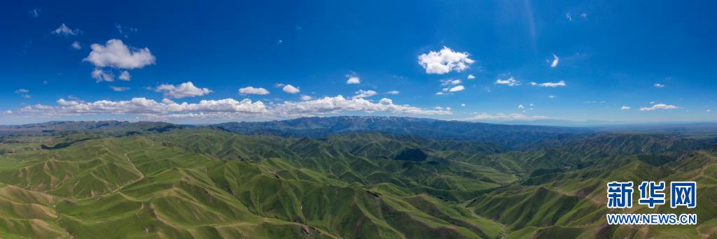 新疆北部裕民縣巴爾魯克山區(qū)夏牧場(6月15日攝,無人機全景照片)。