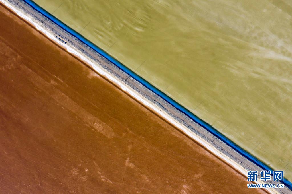 這是在新疆和布克賽爾蒙古自治縣瑪納斯鹽湖中鹽宏達(dá)鹽業(yè)生產(chǎn)基地拍攝的一處灘曬池(6月21日攝,無人機(jī)照片)。