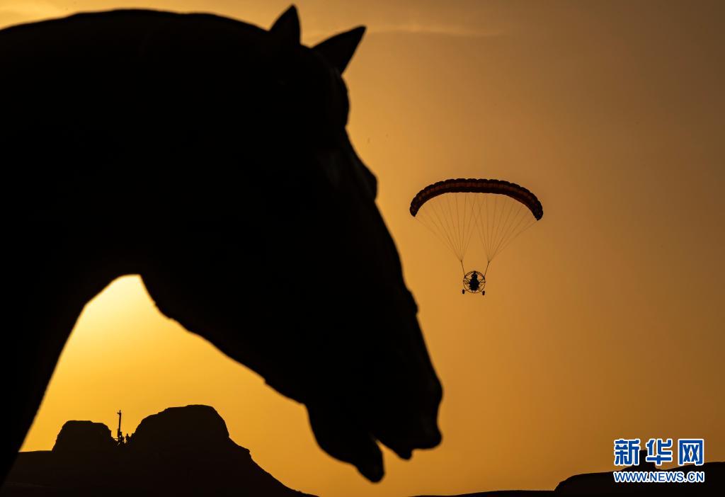 游客乘坐動力傘在新疆克拉瑪依烏爾禾世界魔鬼城景區(qū)內游玩(6月21日攝)。