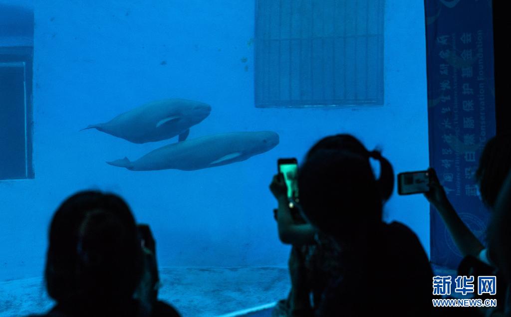 7月5日,小朋友在中國科學院水生生物研究所白鱀豚館舉行的“愛豚月”系列科普活動上觀看這對長江江豚母子。新華社記者肖藝九攝