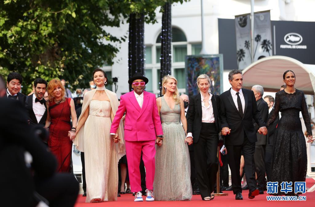 7月6日,第74屆法國(guó)戛納國(guó)際電影節(jié)主競(jìng)賽單元評(píng)委會(huì)主席、美國(guó)導(dǎo)演和制片人斯派克·李(中)攜主競(jìng)賽單元評(píng)委出席開(kāi)幕式紅毯。