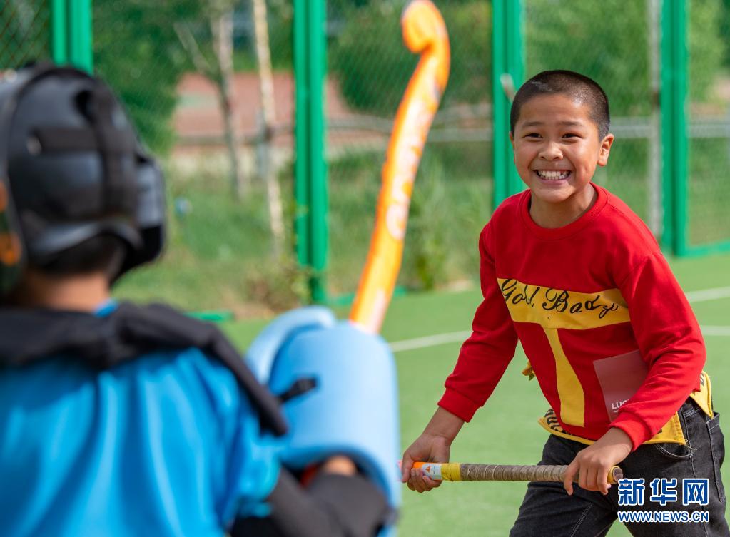 塔城市第二小學(xué)曲棍球隊的小隊員馬子豪(右)在訓(xùn)練中(6月11日攝)。
