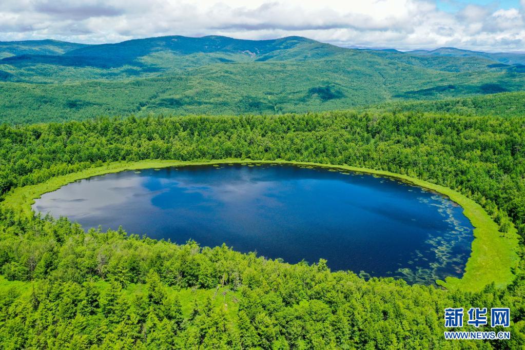 這是7月14日拍攝的阿爾山國(guó)家森林公園內(nèi)的天池(無(wú)人機(jī)照片)。