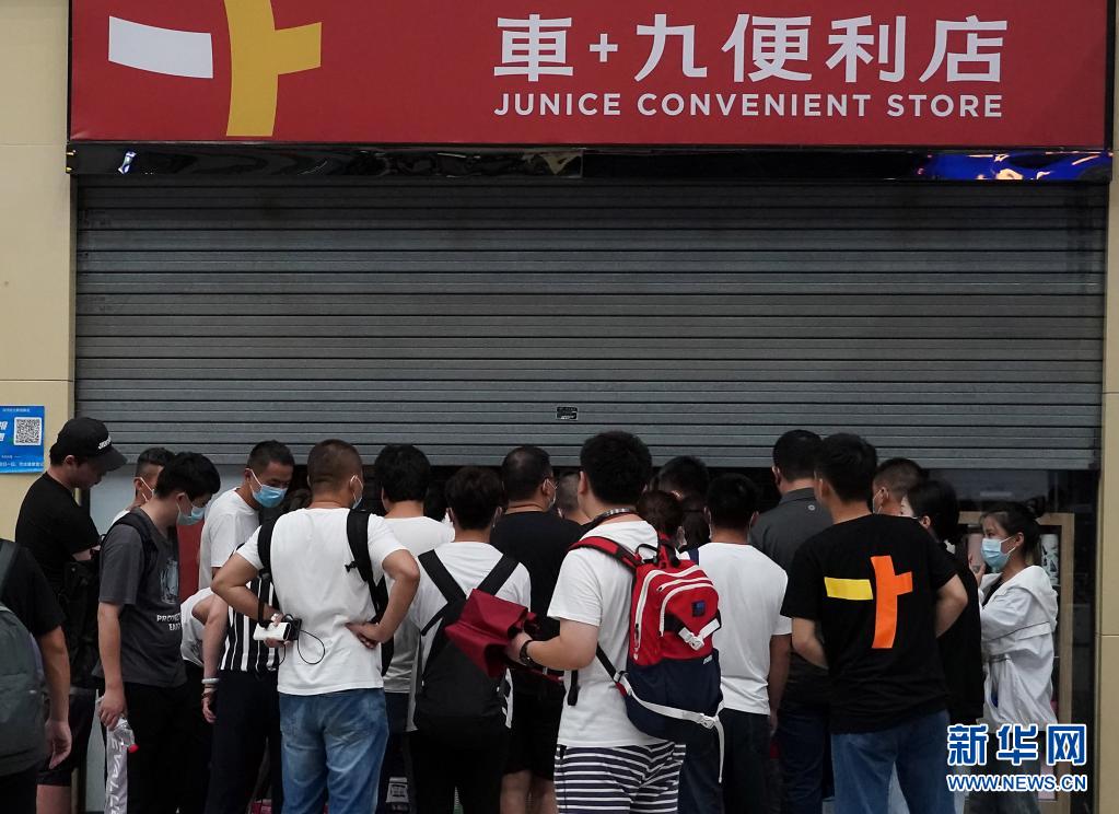 7月20日,滯留旅客在鄭州東站一家便利店外排隊購物。