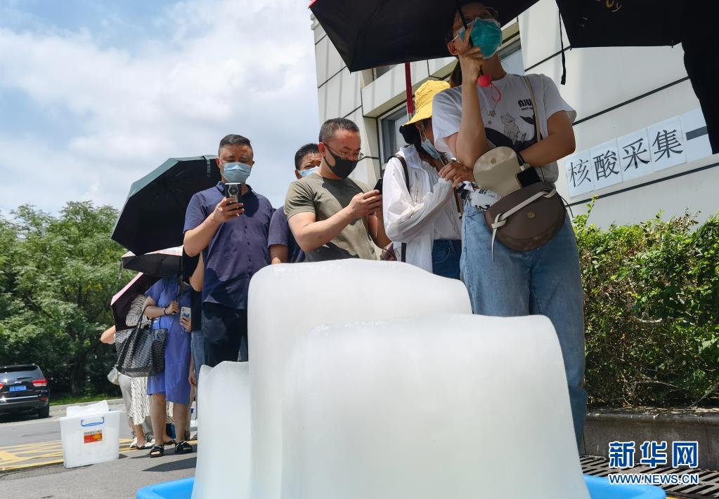 江蘇省南京市于7月21日開始對全市常住人口、外來人員開展全員核酸檢測。目前正值盛夏,氣溫較高,在南京市第一醫(yī)院河西院區(qū)核酸檢測點,工作人員專門為排隊等候的市民準備了冰塊降溫。