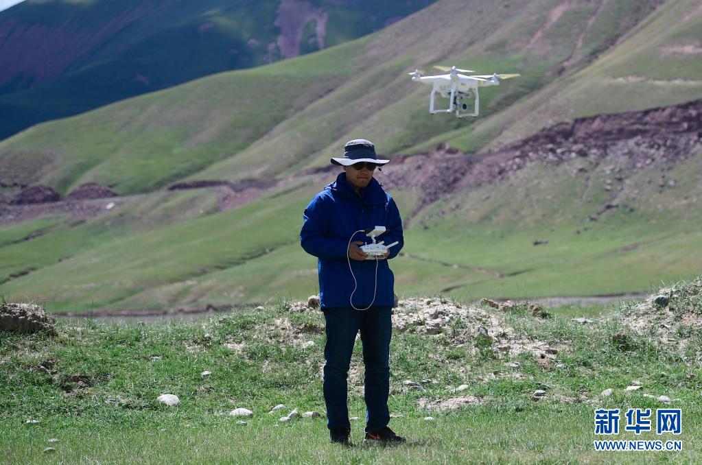 2021年長(zhǎng)江源綜合科考的科考隊(duì)員趙保成在使用無(wú)人機(jī)觀測(cè)長(zhǎng)江源地區(qū)生態(tài)環(huán)境(7月24日攝)。
