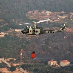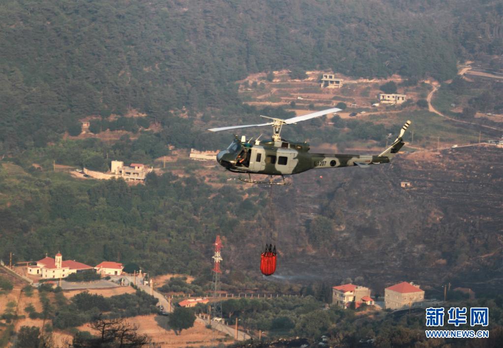 7月29日,黎巴嫩軍方直升機(jī)在阿卡爾省火災(zāi)現(xiàn)場(chǎng)參與滅火行動(dòng)。