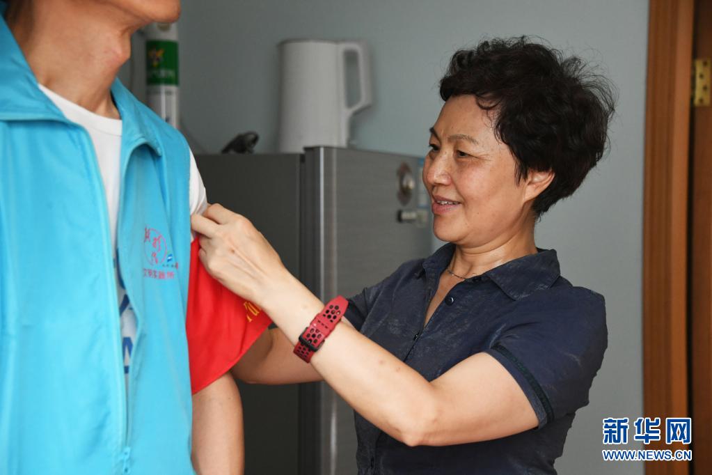 8月14日,在北京市海淀區(qū)薊門里社區(qū),董星梅在家中為準(zhǔn)備去社區(qū)出入口值守的丈夫馮向東整理著裝。