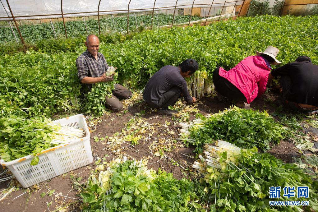 8月13日,在四川省阿壩藏族羌族自治州紅原縣邛溪鎮(zhèn)熱坤村的蔬菜大棚,種植戶在收割芹菜。