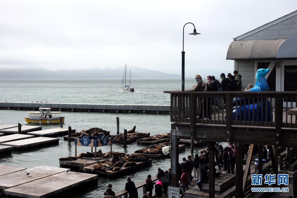 8月15日,人們在美國舊金山海邊觀看海獅。