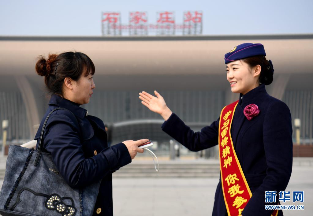 2019年3月5日,在石家莊站廣場(chǎng),中國(guó)鐵路北京局集團(tuán)有限公司京鐵列服公司石家莊分公司高鐵餐吧部的工作人員引導(dǎo)一名旅客前往候車位置。新華社記者 王曉 攝