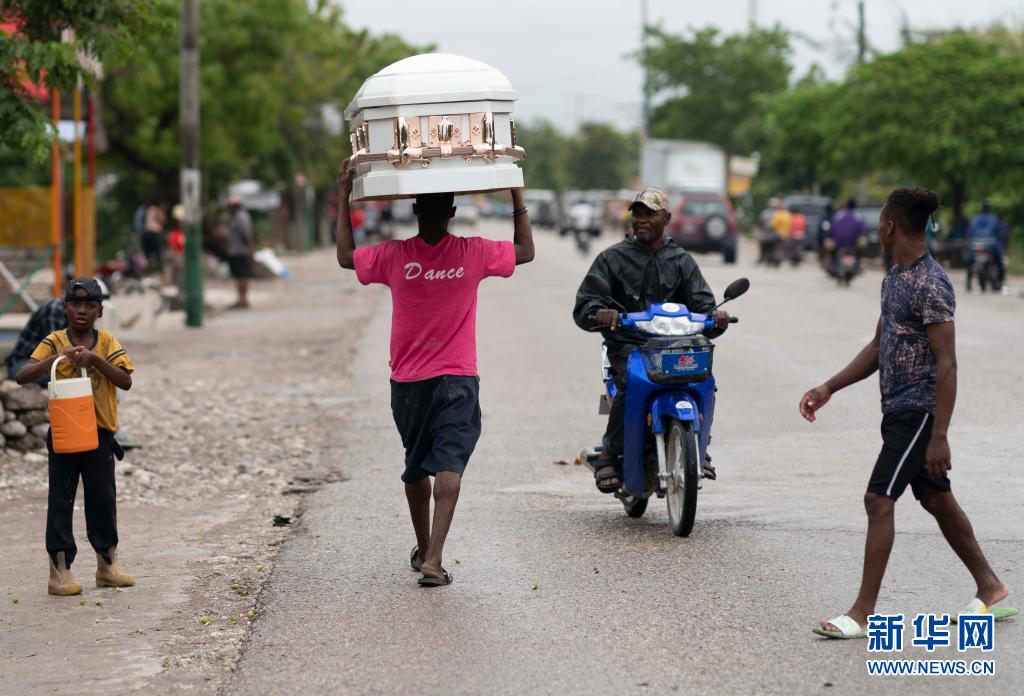 8月17日,一名男子頭頂棺材走在海地萊凱的街道上。