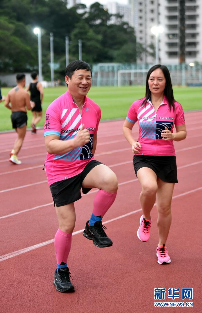 猛龍長(zhǎng)跑隊(duì)創(chuàng)辦人莫儉榮(左)與領(lǐng)跑員嚴(yán)惠茵訓(xùn)練前進(jìn)行熱身(7月29日攝)。