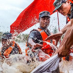 這是河北武警戰(zhàn)士在長江大堤上搶險(1998年8月16日攝)。