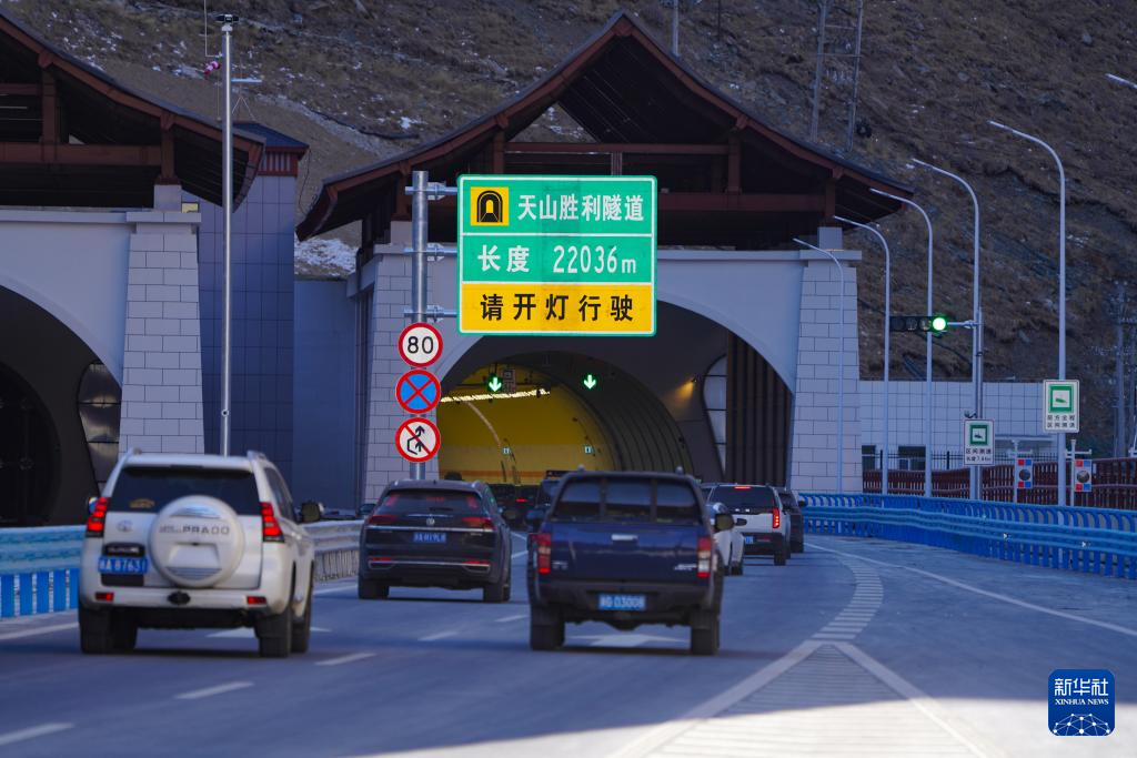 12月26日,车辆驶出新疆乌尉高速公路天山胜利隧道(无人机照片)。