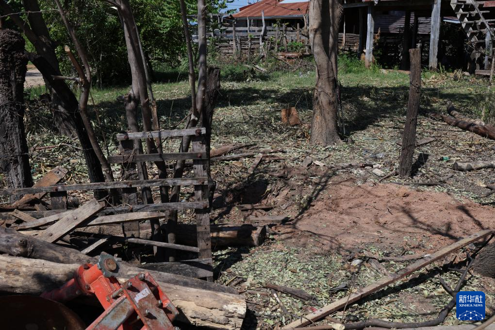 这是12月29日在泰国沙缴府临近柬埔寨的边境地区拍摄的一处民居旁的弹坑。